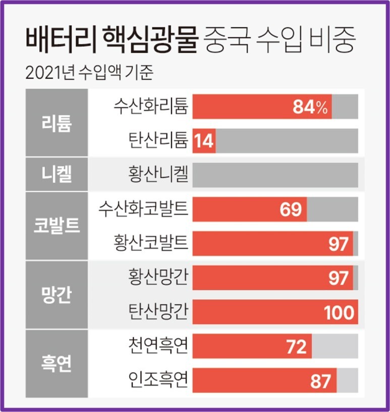 우리나라 배터리업계의 핵심광물은 중국 의존도가 상당히 높은데 주요 핵심광물인 리튬과 코발트는 상당 비중을 중국산에 의존하고 있다